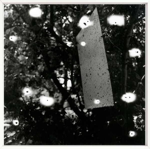 Flare propone parasitar la imagen por medio de la luz a partir de la manipulación directa del soporte fotosensible, donde se permite deliberadamente la entrada de luz por pequeños orificios, generando una presencia lumínica no controlada que se infiltra en la imagen como un cuerpo ajeno. En la tradición fotográfica, el flare o luz parásita es considerado un error óptico: una irrupción no deseada de luz que contamina la imagen. Esta serie se apropia de ese accidente y lo convierte en principio estético y gesto principal de las piezas. La luz, que habitualmente construye y da forma a lo visible, aquí irrumpe como agente invasivo, alterando la superficie de la imagen desde dentro. Flare plantea una simbiosis entre el motivo y el proceso fotográfico. Por un lado, se presentan insectos atrapados en trampas lumínicas —seres que perforan, habitan y se alimentan de otros cuerpos— mientras que por el otro lado, las propias imágenes son devoradas por la luz. Tanto la luz como los insectos actúan como parásitos: se filtran, carcomen, se instalan y quedan atrapados donde no fueron invitados.