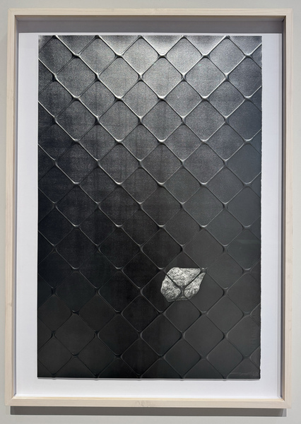 En esta pieza, el horizonte es delimitado por una reja que funciona simultáneamente como prisión y contenedor de ideas e identidad. Este horizonte, creado por el hombre, encierra lo que queda de un fragmento inalterado del paisaje, reflejando las tensiones entre lo natural y lo artificial, lo confinado y lo liberado.