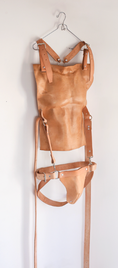 Bromance es una pieza/accesorio de la serie “Vestigios de valor” que explora la tensión entre amistad masculina e intimidad, cuestionando las fronteras impuestas por la heteronorma. A través de objetos de cuero y formas corporales, la obra convierte símbolos asociados a la virilidad en un cuerpo de deseo y vulnerabilidad. En este cruce, lo que parece rígido se vuelve frágil, revelando los silencios y curiosidades que atraviesan la masculinidad contemporánea