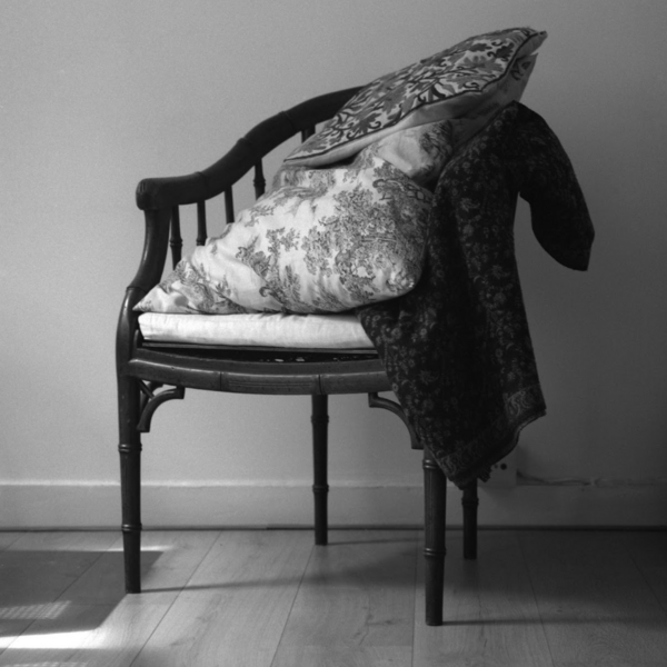 En la fotografía de Darío Fernández, se aborda el acto de dormir a través de la ausencia del cuerpo: dos cojines y una frazada dispuestos sobre una silla. La imagen remite a la idea de que alguien ha retirado esos objetos para acostarse en una cama en la misma habitación.