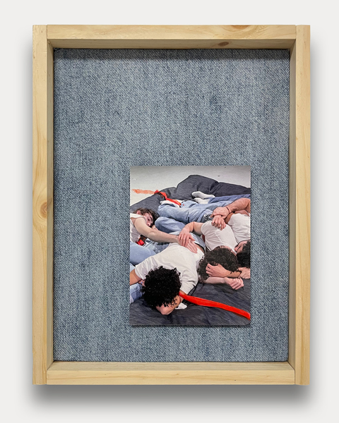 "“Scott” forma parte de un conjunto de obras que documentan momentos íntimos de la performance ""Collective Cuddles"" (2023). Estas piezas han sido intervenidas con oil sticks y adheridas a tela vaquero, la misma que fue utilizada por los performers en el Camden Art Centre. La obra se presenta en un marco hecho por el artista. En Collective Cuddles de Rey, cinco hombres, todos vestidos con camisetas blancas idénticas y jeans azul claro, se reúnen en The Cuddling Platform, un gran cojín de mezclilla. Allí, se entregan a un contacto físico suave, explorando ideas sobre la conexión humana. La obra cuestiona las nociones convencionales de masculinidad en sociedades patriarcales y subraya la importancia de expresar afecto más allá de las relaciones románticas tradicionales."
