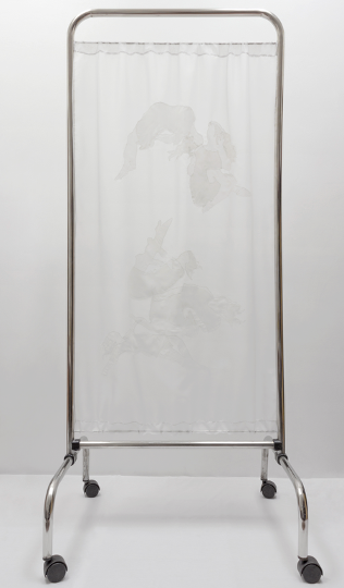 Esta pieza aborda el las narrativas de la histeria construidas por Jean-Martin Charcot y el impacto que aún tienen en la atención médica de las mujeres en la actualidad. Las siluetas de “ataques epilépticos e histéricos” de pacientes de La Salpêtrière, están cosidas sobre la pantalla traslúcida de un biombo hospitalario, como velo que media la mirada médica hacia el cuerpo de la mujeres.