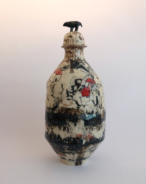 Esta pieza comenzó como un experimento con el barro pigmentado, explorando cómo la imagen puede convivir con el color de la materia misma. Mi intención inicial era pintar un bosque, aunque no sabía hasta qué punto la imagen sería visible sobre la superficie. Comencé con los árboles y, poco a poco, fueron apareciendo personajes. Me di cuenta de que no se trataba tanto de construir una narrativa específica, sino más bien de dejar que la pieza se convirtiera en un reflejo de los sentimientos que estaba atravesando en ese momento.