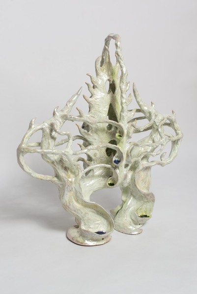 "Esta pieza surge de la tensión entre lo orgánico y lo intervenido por lo humano, estados de la materia que se revelan con el tiempo. Su forma sinuosa y ramificada evoca un sistema vascular o una red de raíces, encarnando procesos anatómicos, vegetales y arquitectónicos. Fibras y filamentos se expanden en múltiples direcciones, registrando la circulación y fragmentación de la energía en la materia. La obra se asemeja a un organismo casi vivo que transita entre estados temporales: el pasado—remanentes de memorias personales o colectivas; el presente—un núcleo que brinda soporte esquelético; y el futuro—fibras que brotan y se extienden en el espacio. Su forma híbrida remite a exoesqueleto y relicario, resistiendo toda línea temporal fija. La cerámica ancla esta dimensión alquímica. Extraída de la tierra y transfigurada por el fuego, la arcilla se vuelve umbral donde lo orgánico se funde con lo mineral, lo frágil con lo perdurable. La obra funciona como reliquia y profecía: archivo de transformación corporal y mítico, material y especulativo."