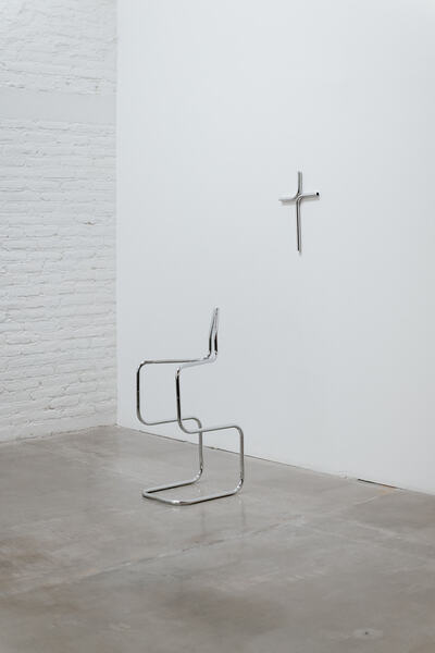 El predicador ensambla dos sillas Cesca —iconos del diseño moderno— en un gesto de plegaria. En el muro, los fragmentos forman una cruz que refuerza la liturgia implícita. La obra yuxtapone lo secular del objeto funcional con lo sagrado del símbolo, sugiriendo que la modernidad, incluso en su versión replicada, también genera sus propios altares.