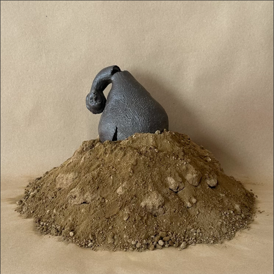 Esta instalación entrelaza la escultura de Morales con la pieza sonora en colaboración con Corazón de Cedro de Tinoco. La obra reúne gestos poéticos como un encuentro de cosmologías, donde distintas memorias, territorios y saberes dialogan desde la escucha profunda. La escultura*, en su forma amalgama emociones que anteponen el deseo de estar en la tierra, como querer mirar el paisaje; las cartografías se desarticulan y se expanden en el cuerpo, como cuando rueda la piedra, así se marca un punto de referencia que da lo vertical y por la exageración de la atmósfera lo horizontal. La obra expresa las sensaciones de la vida, es pensar en el tránsito del girasol o el brotar de las semillas: una fuerza centrífuga de identidad que nos lanza hacia nuestras luchas personales y la manera en que las proponemos en el entorno, sin oponernos a la adaptación, sino ubicándola. La pieza sonora**, por su parte, es una colaboración con "Corazón de Cedro", un proyecto musical integrado por mujeres con base en el barrio Mission en San Francisco, California. La pieza, arreglada a partir de tres canciones tradicionales - Las Poblanas (Son Jarocho), Ya Banat Iskandaria (música árabe tradicional) y Café con Pan (Son Jarocho), convoca tradiciones orales ancestrales: el Son Jarocho y la música árabe tradicional como archivos vivos de cuidado comunitario, regeneración y memoria. El sonido se convierte en método de preservación histórica y en vehículo de solidaridad transfronteriza, conectando las luchas de comunidades indígenas, diaspóricas y de las mujeres. Escuchar a la tierra es también escuchar a las voces que han querido ser silenciadas, al llamado interno que insiste. La instalación se despliega así como un poema al tiempo, a los lugares que nos atraviesan y a los sueños que nos unen, sembrando desde abajo la posibilidad de otros futuros compartidos. *Bitácora de quema de “Mujer que escucha su ombligo” (2022 -2026) 26 cm temperatura altura 1 700º horno de leña 2 1050º horno de leña 3 1100º horno de gas 4 1205º horno de gas 35 cm 30 cm 29 cm 26 cm ** ”Ya Banat Poblanas” está disponible para libre reproducción y compra en soundcloud. Músicxs: Evelyn Donají Arellano - jarana segunda, voz/ Camellia Boutros - oud, tabla, voz/ Yuridia Ollincihuatl Martínez - jarana tercera, voz/ Tanya Benítez - jarana tercera, voz/ Yanelit Madrís Zarate - zapateado, voz. Letra: Evelyn Donají Arellano, Daniela Tinoco, Emigdio Cano Mendoza/ Arreglo: Evelyn Donají Arellano y Camellia Boutros. Productoras: Evelyn Donají Arellano, Camellia Boutros y Daniela Tinoco. Ingeniera de grabación, mezcla y masterización: Camellia Boutros.