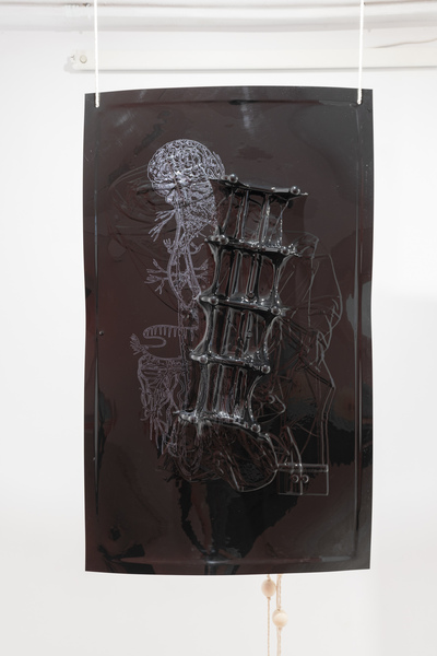 Black thermoformed polystyrene, with UV-print with illustration of vagus nerve, cloths, found object, wood beads, cotton robe