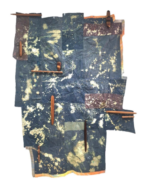 Una superficie textil de ensamblaje de sábanas familiares usadas funciona como mapa sensible para una navegación simbólica de lo abismal. Entre lo artesanal y lo cósmico, la obra conjuga pintura y escultura desde prácticas heredadas de resistencia y retorno. Herramientas primitivas talladas en madera, revalorizadas como joyas de la vida, desde el gesto lento y de respeto matérico, activan una poética del desgaste para navegar lo vasto del universo.