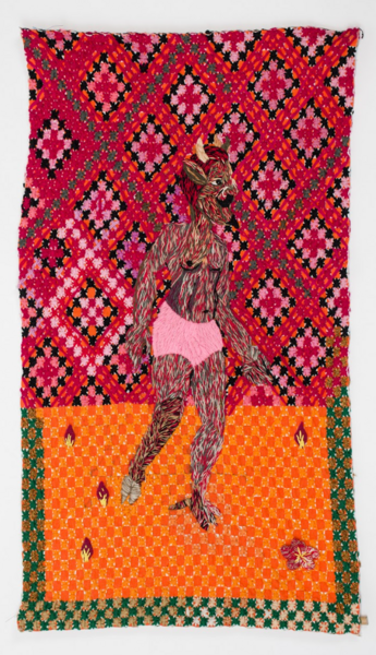 El diablo es el dios del inframundo, guardián del fuego primigenio y de los espacios de tránsito entre la vida y la muerte. Representa un carácter ambivalente y peligroso, pero también de potencia regeneradora. El inframundo no es aquí un lugar de castigo, sino un espacio de gestación y resguardo de fuerzas esenciales. El diablo bordado aparece como custodio del equilibrio entre destrucción y renovación, recordando que todo fuego nace en la oscuridad.