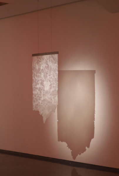 Fragmentos de pegamento seco con la impronta de la piel de la artista, una calca cutánea configurada en metros cuadrados, como si se hablara de un terreno. La medida de la pieza es determinada por el cálculo de DuBois para obtener la superficie corporal, el cual dicta los 1.67 m2 según las propias dimensiones.
