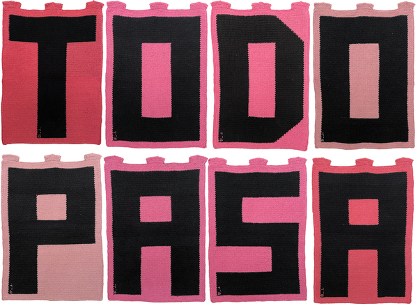 A partir de una serie de lecturas, investigaciones y charlas sobre el problema de la colonización ontológica, epistémica y artística se busca extraer una serie de aforismos que ayudan a ampliar el debate decolonial en el campo de las artes visuales; al realizar esta selección gramática se pretende implicar el hacer-escribir-pensar, mismo que se encontrará reiterado en la pieza propuesta. La pieza tiene utiliza el recurso de la re-escritura y establece-genera un aforismo: Todo Pasa, el cual permite pensar como nada en este mundo es permanente, y como al saber que lo transitivo, cambiable y mutable es parte de la vida. Nada permanence por siempre, tanto lo bueno como lo malo, lo alegre como lo triste, lo macro como lo micro, todo es perecedero. En esta pieza se trabaja con una paleta de color reducida y una técnica llamada intarsia, la cual permite ir adhiriendo fragmentos de color que se intercalan con el fondo de la imagen tejida.