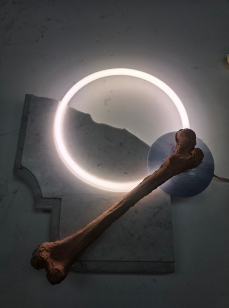 Yahualtic tonalli (2025) explora una traducció n simbólica entre yahualtic, la lı́nea circular, y el concepto nahua del tonalli. Má rmol, terracota, neó n y vidrio articulan una reUlexió n sobre la condició n humana: el fémur como vestigio, la piedra como permanencia y la luz como energı́a vital. El sı́mbolo se desplaza y se resigniUica en un sistema de relaciones materiales y lumı́nicas.