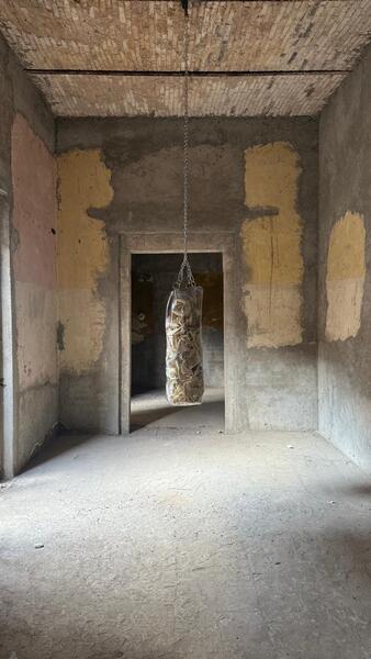 Este objeto desplaza su función original para convertirse en metáfora: un campo de batalla simbólico entre la vida y la muerte. El costal, tradicionalmente usado para entrenar y fortalecer el cuerpo, aquí encierra la fragilidad de lo humano. La acción de golpearlo se transforma en un ejercicio ritual de resistencia, donde cada impacto encarna la lucha cotidiana por prolongar la vida frente a lo inevitable. La escultura invita a pensar la existencia como un entrenamiento constante: un combate que se practica a diario, en el que la muerte no es un enemigo externo, sino un adversario íntimo y persistente, siempre presente dentro del propio cuerpo.