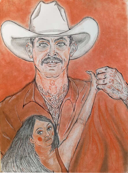 Un rudo vaquero y una diminuta joven disfrutan una pieza de baile. Tras la escena jocosa, el dibujo ofrece pistas sobre el trabajo sexual en un congal. Las representaciones de género y raza son visibles en la obra. La relación de dominación es ambigua: un cliente extasiado y una trabajadora indiferente, buscando con la mirada un mejor postor. El fondo rojo de la sanguina se funde con sus siluetas, simulando la atmósfera de un infierno.