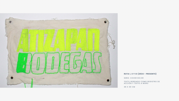 La serie Cover $12.00 toma como inspiración los letreros de las combis procedentes de la Zona Metropolitana norponiente de la Ciudad de México, cada uno correspondiente a rutas que me llevan a casa. El bordado se realiza como una acción in situ durante estos trayectos, convirtiendo a los textiles tanto en un registro, como en un ejercicio de visualización temporal.