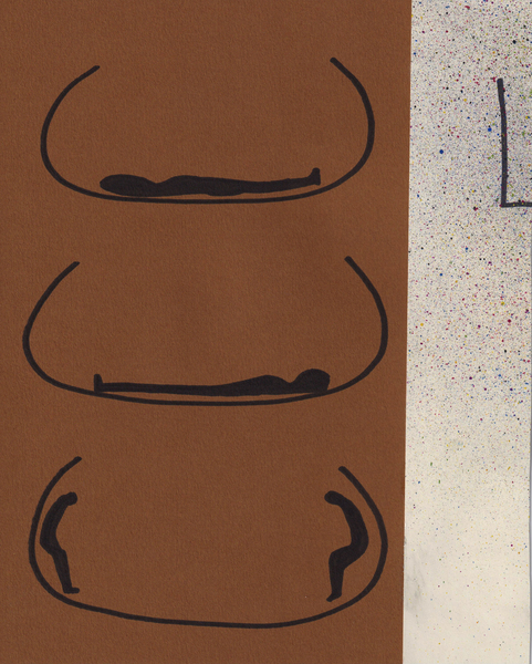 Pertenecen a una serie grande de aproximadamente 120 dibujos que la artista elaboró durante 3 años. Se pueden entender como pre-escenas, maquetas de narrativas y aproximasiones a su proceso escultorico, sin embargo el dibujo se mantiene autonomo en si. De ahí su alto valor y relevancia en el trabajo de Wozny. En este dibujo, las Cs recostadas son arquitecturas- contenedores para figuras humanas en diferentes situaciones y momentos de su vida/muerte.