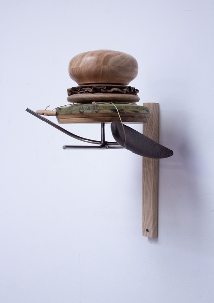 'Green Stack (collar)’ was made during my artist residency at Blackhorse Workshop, East London, during which was thinking around the sculptural possibilities of wood-turning and its relationship to toolmaking and garment production. This object deconstructs various shaping forms found within millenary blocks, reconfiguring them into a kind of abstracted totem. The work considers the boundaries of costume and tool/ mould, dressing the stack with embellishments taken from items of clothing and furniture.