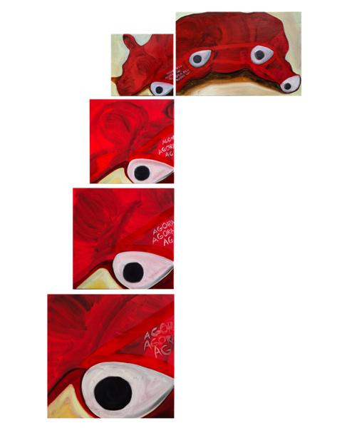 What an odd pose the seller chose to showcase this antique porcelain rhino in: Laying on its side with its painted-on eyes eternally open, it looks either hurt or dead. Its legs are stiff and projected towards the viewer, making it possible to see the bottom of its hooves - teardrop-shaped and with a circular hole in their center. The magical beast with eyes for paws has been slayed, and its story must be told. I tell this story through painting because painting is how i speak, and because every painting is a spell, I get to make four wishes - one for each eye-hoof. After the piece is finished, I conclude that the area around the frontal eye-hoof is my favourite part of the painting, its shapes and colors especially interesting. I paint the rhino again three more times, zooming-in on this detail, trying to figure out what about it is so alluring. Does this mean I get to make seven wishes? With each close-up, the word NOW seems louder. The eye looks back at me with ever-increasing interest.