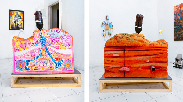 Esta obra nos engolosina con los detalles que brotan de un volumen escultural, socavón imaginario del volcán Iztaccihuatl. Desde un ángulo percibimos parte de su perfil, pero, contrario a la leyenda, la mujer dormida entretiene su espera eterna empinándose una enorme botella de Coca Cola. Símbolo del perfeccionamiento de la publicidad y sus metodologías erotizantes del consumo. Ya dentro, la escultura se convierte en dibujo: un corte sagital muestra a la tierra convertida en comic-hormiguero industrial-atracción. Cada uno de los paneles presenta una escena interconectada por el flujo que anima los objetos a su alrededor.