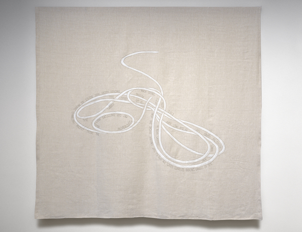 "“The Archaeologists” forma parte también de la serie de los “Poems of inner water”, dibujos y poemas desplegando mitologías del agua. En una época íntimamente ligada a la memoria y al tiempo, los arqueólogos desarrollan una nueva práctica, más sensible y táctil, en la que su piel entra en contacto con las aguas y percibe los tiempos que estas han atravesado. Investigando a través del tacto, descienden a las profundidades del océano y extienden sus manos para sentir las temperaturas de civilizaciones desaparecidas hace tiempo. Los poemas del agua interior empezaron en 2021 y desde entonces han tomado múltiples formas: sobre papel, a modo de mural en el espacio, y ahora en el medio textil. Después de una residencia en los Ángeles en 2025, pude profundizar en las características que aporta la tela, un soporte que se puede mojar, y de alguna manera, traer el agua al espacio expositivo. Realicé una serie de bautismos performáticos en los cuáles los dibujos y poemas se sumergían en las aguas del Río Los Ángeles, habitando las aguas que relataban."