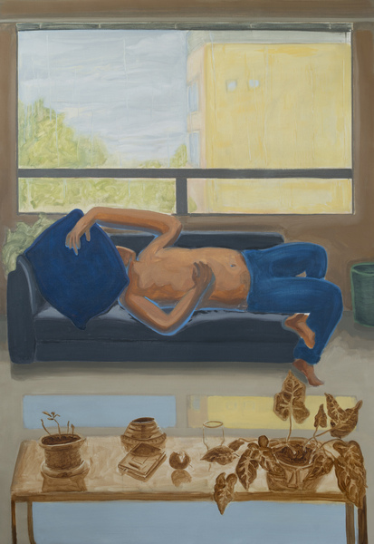 Esta pintura la he dividido en tres zonas principales, podemos ver una persona recostada en un sillón con una almohada cubriéndose el rostro, una ventana detrás con marcas de lluvia deslizándose sobre esta y una mesa con objetos, la cual está pintada con siena de sombra tostada propuesta con un mero planteamiento. En esta pintura busco representar tanto ilustrativa como puesta en práctica el ocio y la procrastinación. Ilustrativa sería con la escena en sí, de una persona reposando, y puesta en práctica con ese elemento de la mesa "sin completar". Con esto busco generar un cuestionamiento hacia el fenómeno psicológico y social asociado al capitalismo moderno que pasamos en este momento histórico, pues hay un condicionamiento y una exigencia constante hacia el hacer, hacia "terminar" lo que se empieza y a la autoexplotasión.