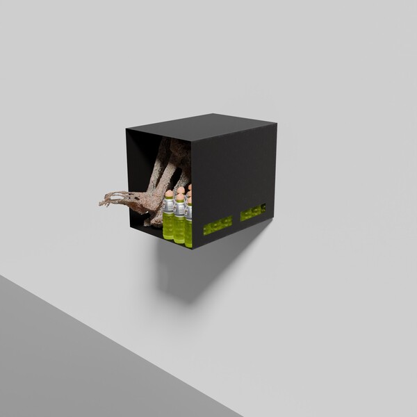 Escultura que confronta procesos arqueológicos y patrimonios ancestrales con teorías alienígenas, explorando su mercantilización y confusión/deglución dentro del digestorio cultural del capitalismo tardío. El montaje propuesto incluirá una disposición expandida de botellas de Gatorade que acentúan la tensión entre lo ritual y lo consumible.