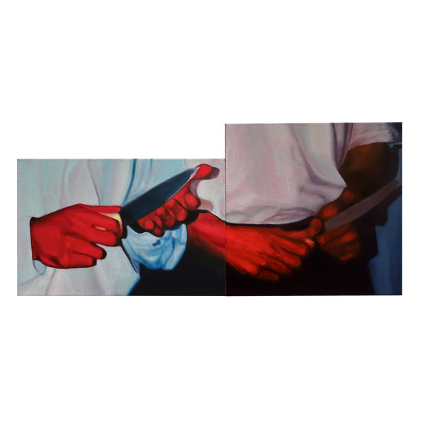 Call and Response, like my other paintings, explores the distortion of fragmented memories through nostalgia and unreliable narration. The image is split in two canvasses, highlighting not only the ''cropping'' process of translating the photo into the painting, but also imposing the physical form of the canvas itself as part of the work.